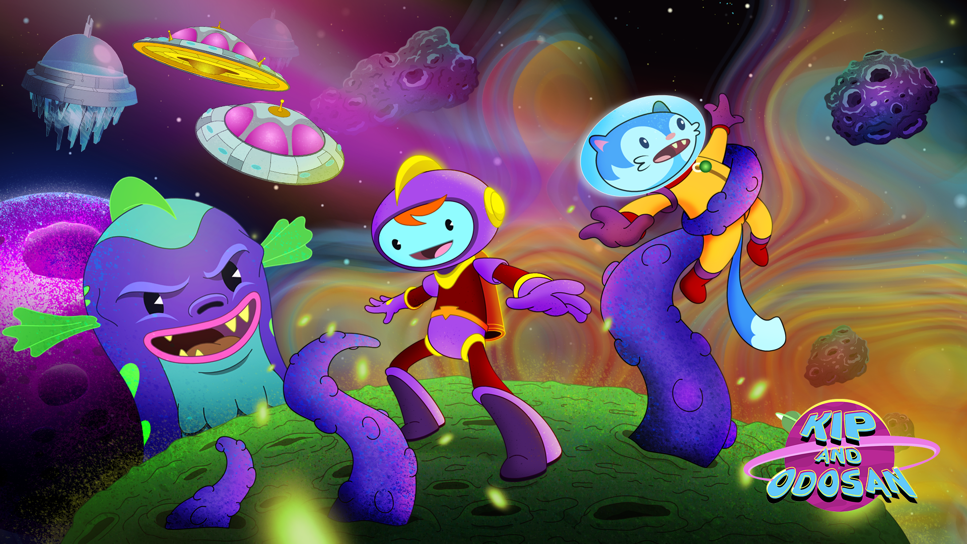 Help Kip run, jump, shoot, swim, and fly her way through the galaxy to save her kidnapped Cat Odosan in the new 2D Platformer Kip and Odosan.